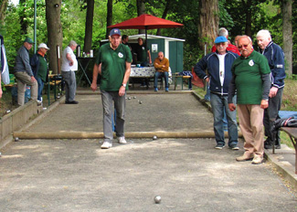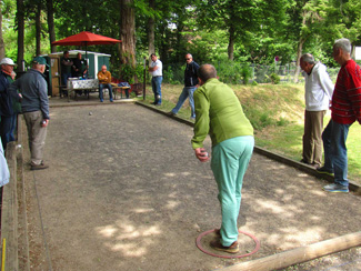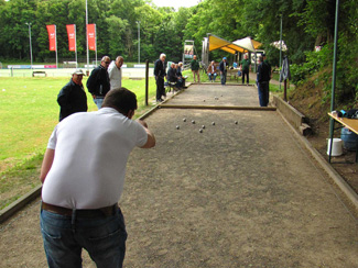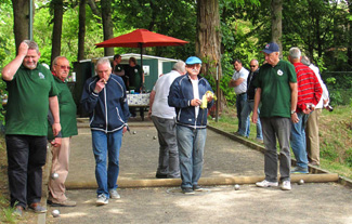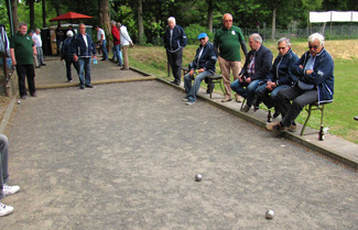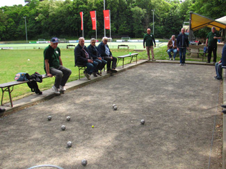 Nach diesem stimmungsvollen Empfang und fröhlicher Runde danach, trafen wir uns am Samstag früh um kurz vor 10 Uhr auf unserer gemütlichen Boulebahn. Blau-Weiß Olten war mit 11 Mann angereist, wovon aber nur 9 spielen wollten, also 3 Triplette. So konnten dann 6 Triplette gegeneinander antreten. Wir einigten uns auf 4 Runden auf unseren 2 Bahnen, jede Partie begrenzt auf 40 Min. Spieldauer. Zwei Mannschaften mußten also ersteinmal zuschauen, bevor sie zum Zug kamen, das war aber für niemand ein Problem. |