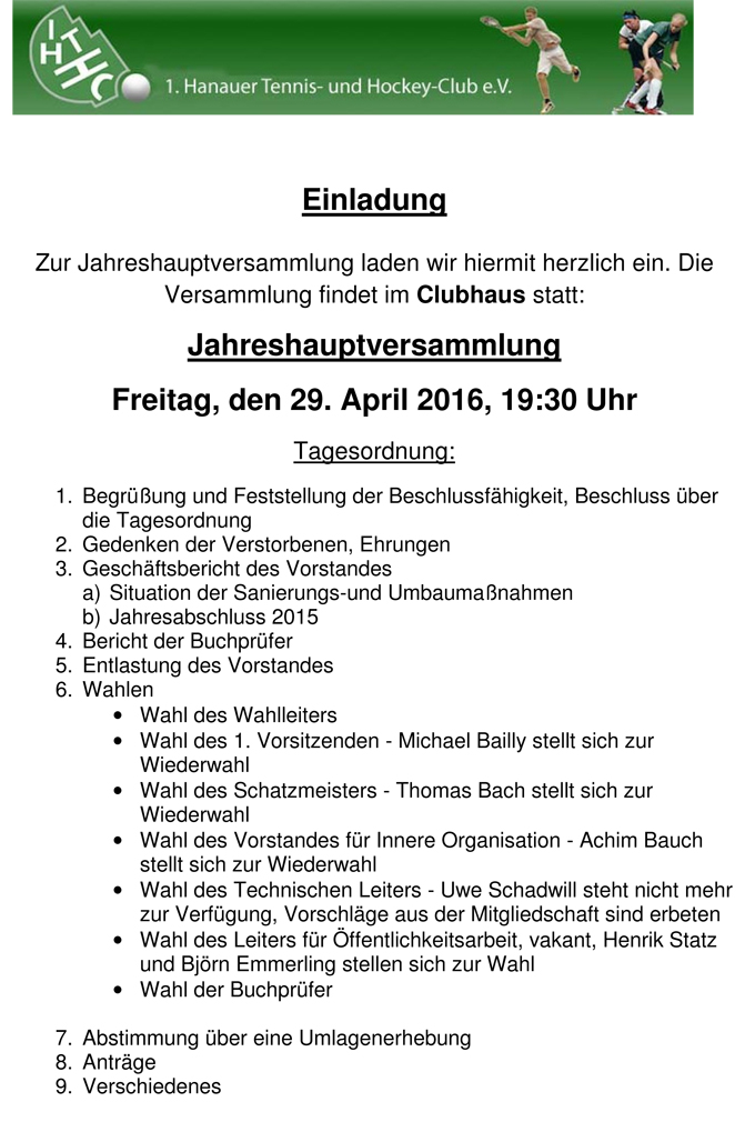 Mitgliederversammlung am Freitag, den 29. April 2016, Beginn 19.30 Uhr, in den Clubräumen