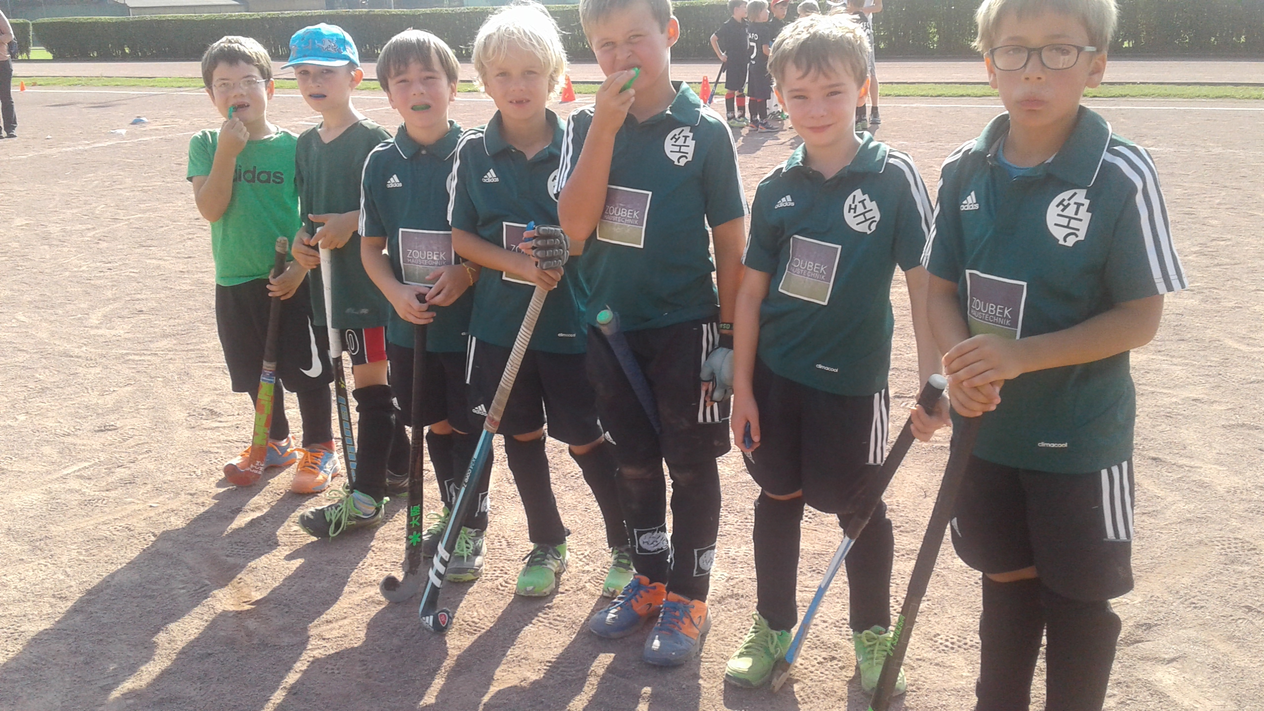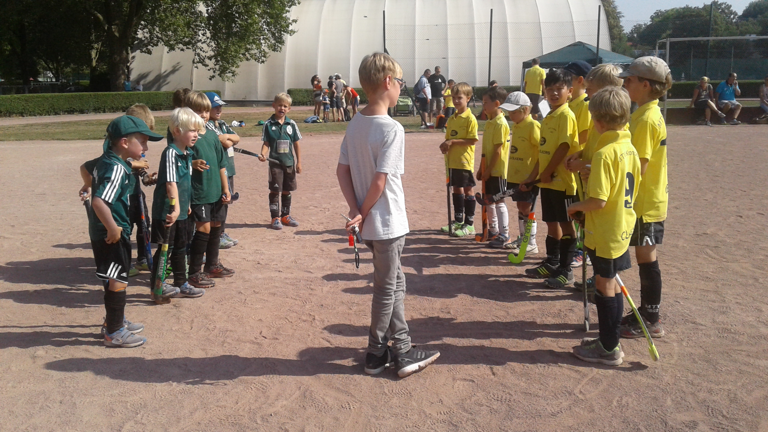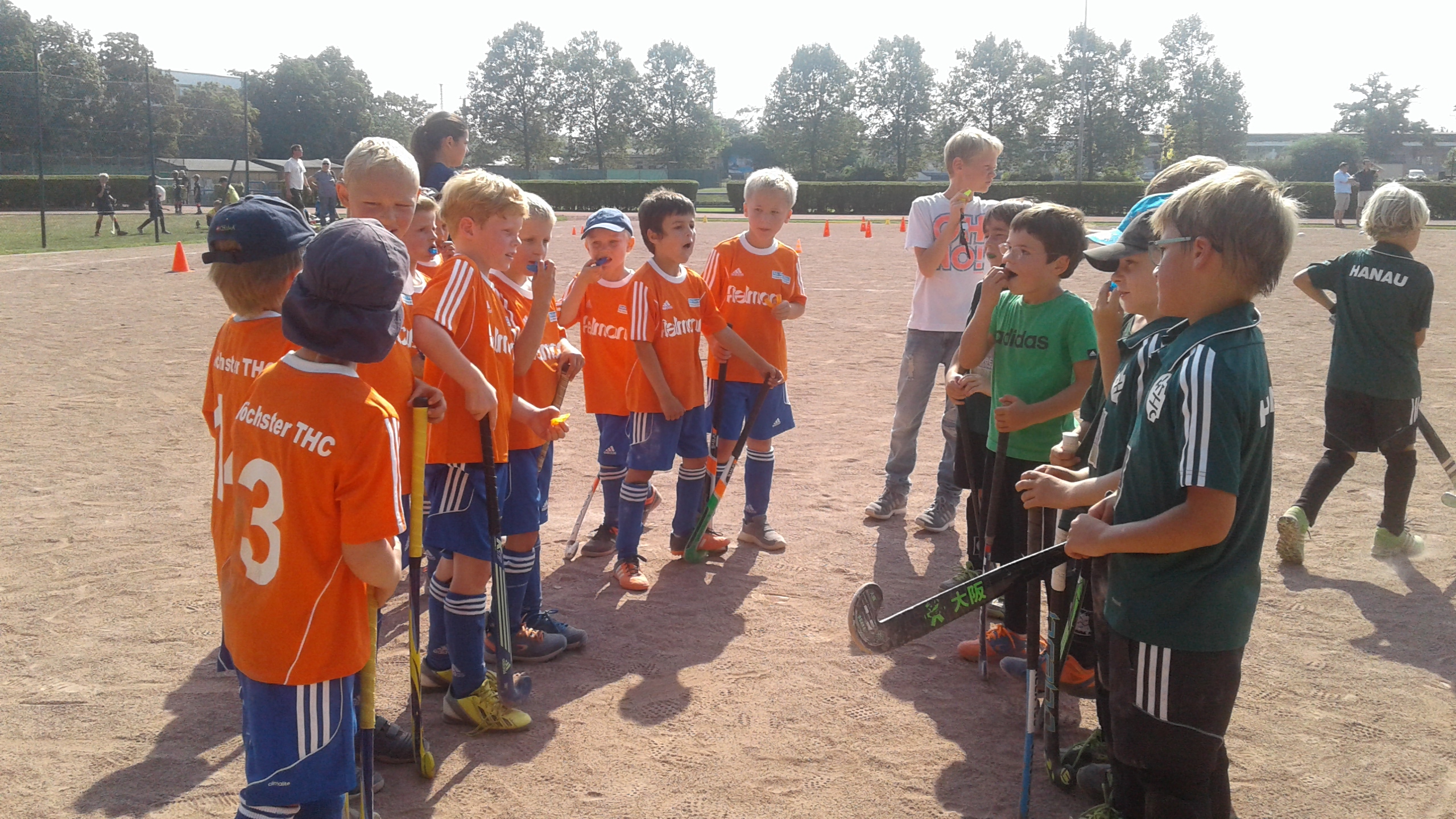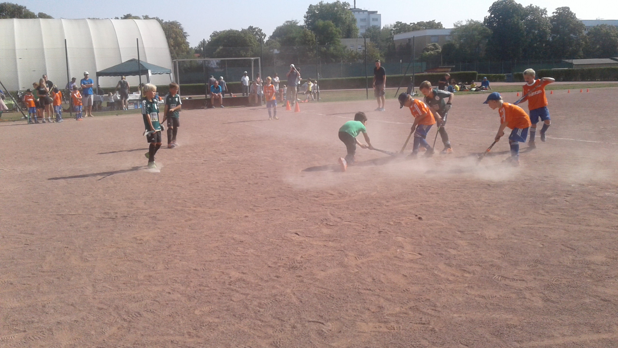 Sommerpause vorbei, Sommercamp noch in schöner Erinnerung, Hockeyabzeichen und die ersten Trainings absolviert, ging's am Samstag nach Frankfurt-Höchst zu unserem 5. Turnier in der Feldsaison 2016. Angekommen, kein Hockeyplatz zu sehen, aber doch schon einige Jungs von den anderen Turniermannschaften. Und die laufen mit ihren Hockeyschlägern auf einen Sandplatz. Nanu, ja das ist der Hockeyplatz vom Höchster THC, ein Hartplatz und für uns eine neue Erfahrung, denn wir sind eigentlich nur Kunstrasenplätze gewohnt. Was soll's - laufen wir erstmal - ohne eine Aufforderung durch unsere Trainerinnen - eine Platzrunde, um unsere Muskel aufzuwärmen, der Rest ist bereits durch die strahlende Sonne gewärmt.