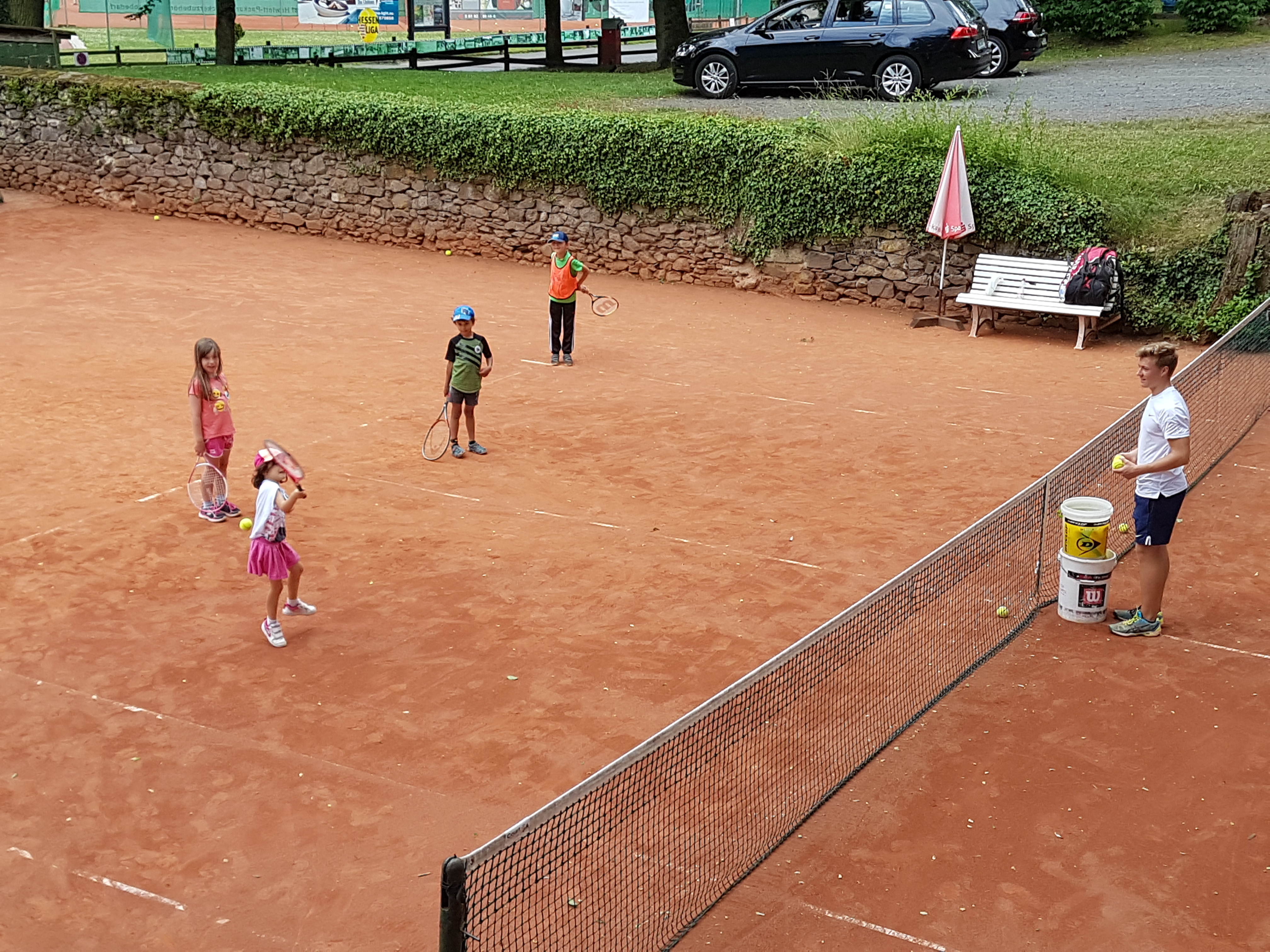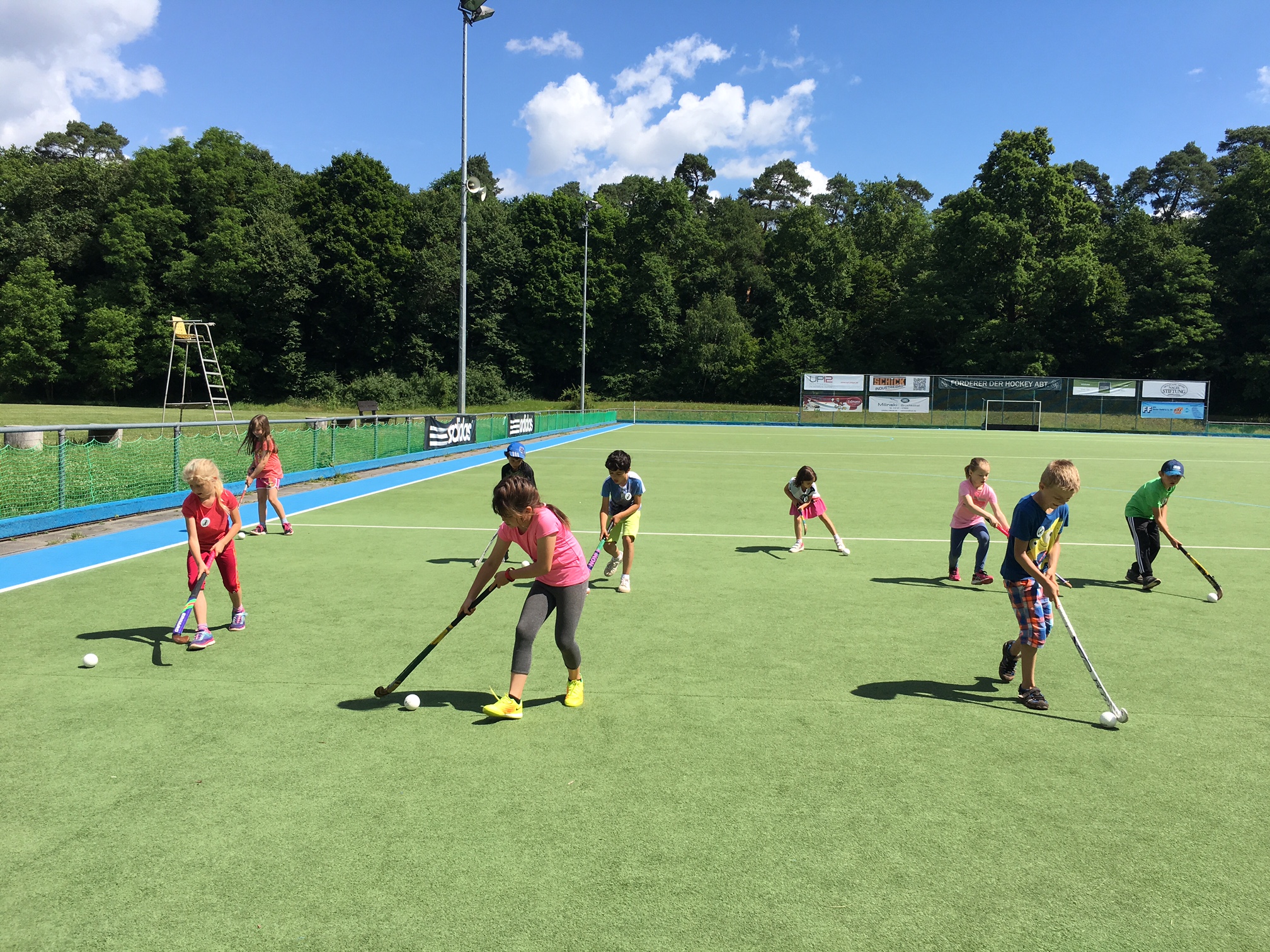 Nach dem Aufwärmen wurden die Kids in 2 Gruppen geteilt und los ging´s mit Tennis und Hockey! Dabei wurde zunächst die grundlegende Technik des Tennis- bzw. Hockeyspiels vermittelt und geübt. Im Anschluss gab es leckeres Essen mit einer ausreichenden Pause zum Relaxen, Spielen und Erkunden unserer Anlage.