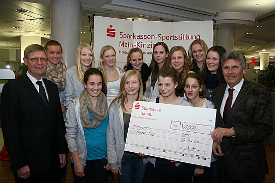 Großer Abend für die Mädchen A des THC: In der Hauptstelle der Sparkasse Hanau überreichte der Stiftungsvorstand der Sparkassen-Sportstiftung mit Bernward Höving (links) und Jürgen May (rechts) dem Team und seiner Trainerin Nadja Bormann sowie Betreuer Dr. Jochen Becker einen Scheck in Höhe von 1000 Euro.