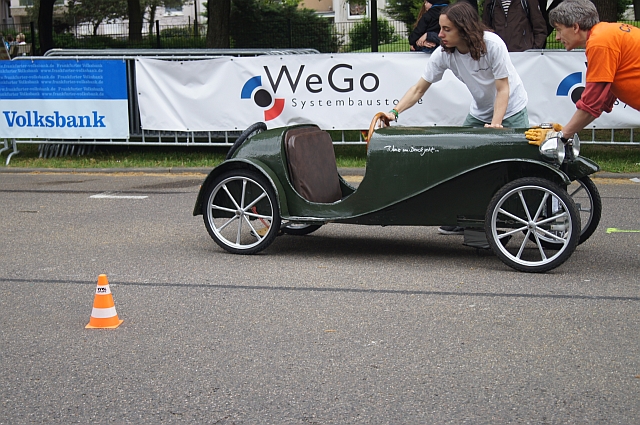 Die Seifenkiste hat Claudia Schramm aus der "Garage" geholt und nach einer Testfahrt vor einer Woche, ging es dann am Samstag ab 8.30 Uhr an den Start. Nach der einen oder anderen Probefahrt hieß es dann um 10 Uhr "Auf die Plätze fertig los!" und die Startklappe an der Startrampe öffnete sich. Ohne Stallorder und immer Vollgas, denn wer bremst verliert!, ging es dann den Berg hinunter. Unten im Ziel wurde der Rennwagen in Empfang genommen und vom Rennteam (den Eltern) wieder nach oben gezogen.