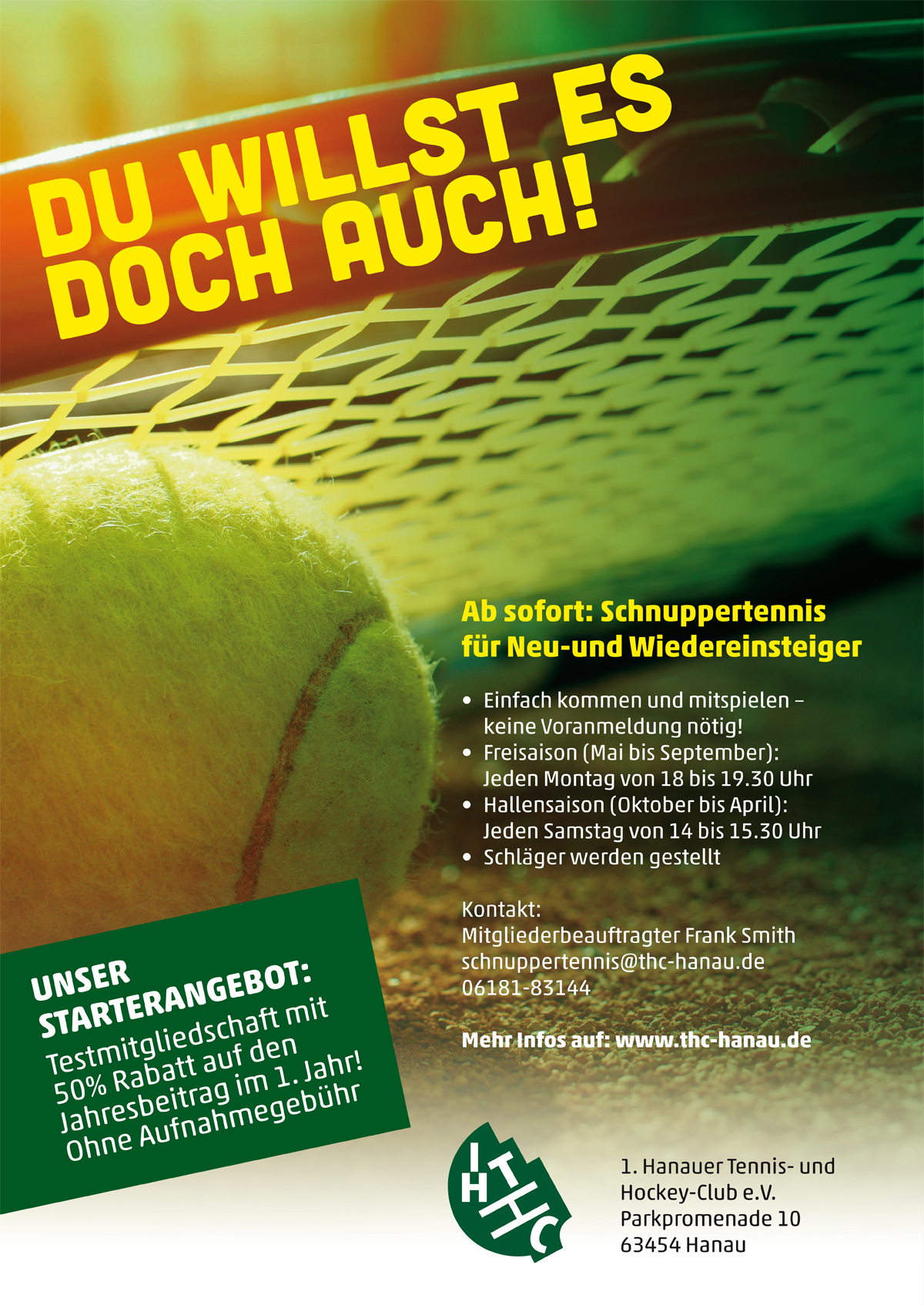 Wir im 1. Hanauer Tennis- und Hockey-Club e.V. verstehen uns weniger als Verein, sondern mehr als eine Familie. Und wie in einer Familie, müssen wir dafür sorgen, dass wir für ein lebendiges Vereinsleben stetig Zuwachs bekommen. Wir haben in den letzten Monaten immer wieder zusammengesessen und überlegt, welche Mehrwerte wir schaffen können, um aus unserem THC einen Ort zu machen, der Menschen anzieht, einen Ort, an dem man gerne ist, wo man Freunde trifft, wo die Kinder Spaß haben und wo sich zwar vieles aber nicht alles, um den Sport dreht. Wir sind davon überzeugt, dass unsere Sportarten und unser Verein für uns sprechen. Hierfür wollen wir aber im ersten Schritt Anreize schaffen, die Interessierte zu uns bringen. Mit unserer Schnuppertennis-Aktion möchten wir erstmal einen selbstbewussten Vorstoß wagen, um neue Mitglieder für unseren Verein und unsere Sportart zu gewinnen. |